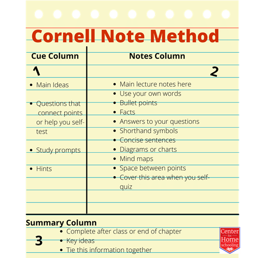 - Reviewing: Use the questions in the cue section to test yourself by recalling the details from the note section.
